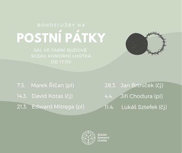 Od 7. 3. začínají u nás postní páteční bohoslužby. Každý pátek do Velikonoc budou v našem sálu probíhat bohoslužby, které povedou pastoři naší církve. Je to dobrá příležitost k zastavení a duchovnímu načerpání.